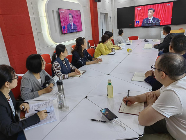 上午九时许,支部全体党员便早早来到观看地点,跟随新闻直播内容了解党的二十大的召开背景与时代意义。大会期间,大家以高度的政治觉悟,严肃认真的态度,一边收听报告,一边认真记录,并不时随着银幕发出阵阵掌声。