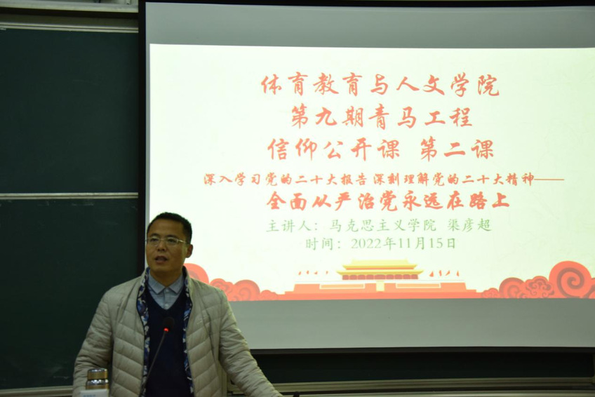 11月15日下午15:30,马克思主义学院青年研习社举办了以“加强党的建设,全面从严治党”为主题的宣讲活动,渠彦超受邀进行授课,马克思主义学院青年研习社成员和部分体育教育与人文学院学生参加了本次活动。