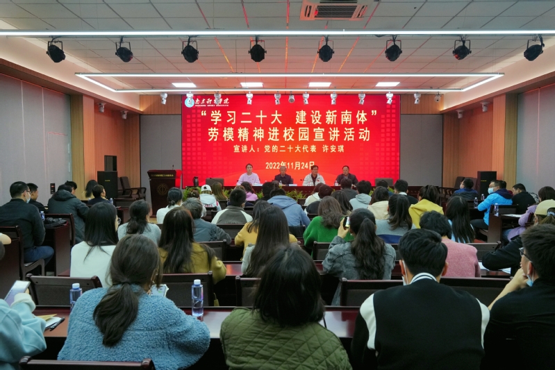 11月24日下午,校工会在工会职工之家多功能厅举办“学习二十大 建设新南体”劳模精神进校园宣讲活动,校党委常委、总会计师黄步龙出席活动并讲话,校党委常委、组织部长陆玉林,各分工会干部及PA视讯近三年入职的青年教职工近80人参加了活动,工会主席王加华主持活动。