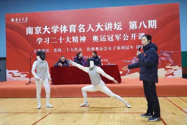 张蕾、王森、陈滔滔三位教练与许安琪一起回答现场学生提问,对击剑运动的起源、礼仪、类别、器材、规则等进行讲解,现场气氛热烈,掌声频频。江苏击剑队运动员身着比赛装备,在三位教练的解说下,为同学们演示了佩剑、花剑、重剑的基本技战术,并进行了实战对抗展示。