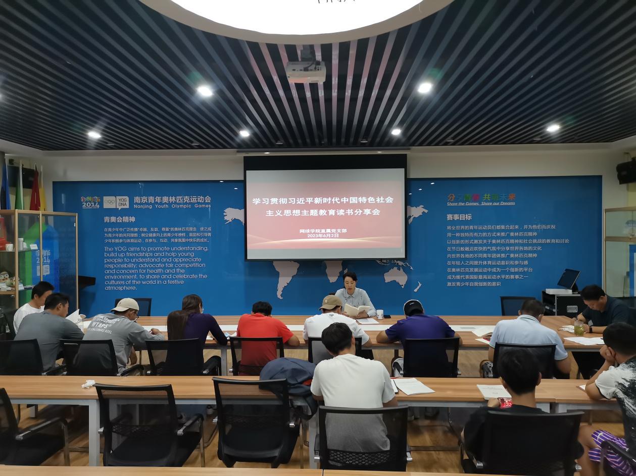 6月2日上午,网球学院直属党支部举行学习贯彻习近平新时代中国特色社会主义思想主题教育读书分享会。网球学院院长鲍勤作读书分享,全体党员、教练员参加会议。