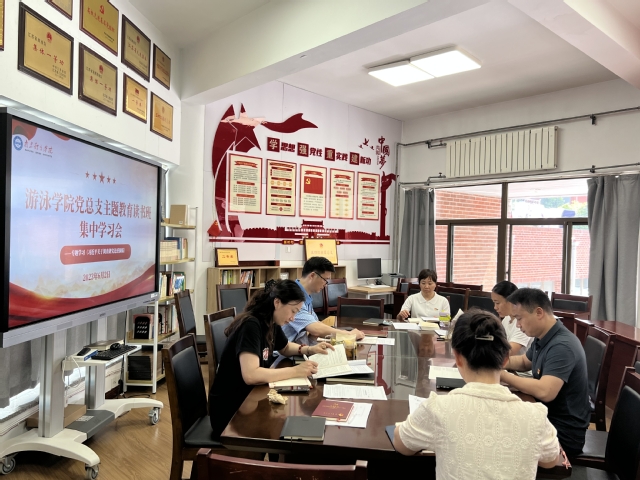 根据《游泳学院党总支学习贯彻习近平新时代中国特色社会主义思想主题教育专题读书班工作计划》安排,6月2日上午,游泳学院党总支在跳水花游馆二楼会议室召开主题教育读书班第六次集中学习会。会议由游泳学院党总支副书记骆晓娟主持。跳水队党支部书记陈妮领学,全体管理干部参加学习。