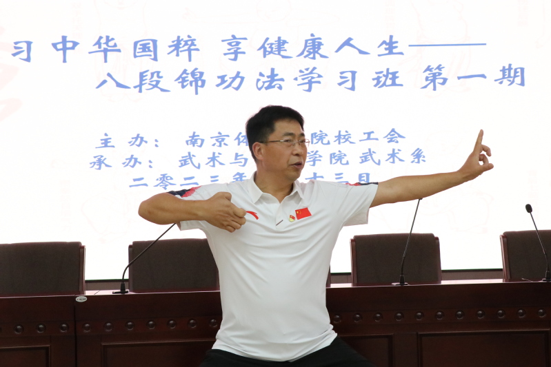 “八段锦”健身功法是国家体育总局推广的全民健身功法之一,是中国传统保健功法,整套动作舒展连绵、动静相兼,是形体运动与呼吸运动相结合的一种独特健身法,易学实用,具有较好的健身和养生效果。授课中,尹海立教授对八段锦口诀进行分段讲解演示,“两手托天理三焦,左右开弓似射雕”,大家随着老师的口诀展开动作,由浅入深地练习,互相交流、反复切磋,初步掌握了动作要领,领略了传统健身功法“调身、调心、调意”的独特魅力,并完成了培训班第一课时的学习任务。学员们纷纷表示,通过参加八段锦培训,既锻炼了身体,也缓解了工作压力,今后会以更加昂扬向上的状态投入到新南体建设中去,为学校高质量发展作出积极贡献。