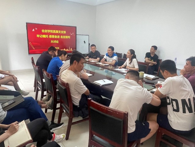 为推动学习贯彻习近平新时代中国特色社会主义思想主题教育走深走实,坚持不懈用党的创新理论武装头脑、指导实践、推动工作,根据上级有关精神及学院主题教育读书班安排,7月3日上午,击剑学院组织开展“牢记嘱托、感恩奋进、走在前列”主题大讨论。会议由击剑学院直属党支部书记朱小兰主持,全体党员参加讨论。