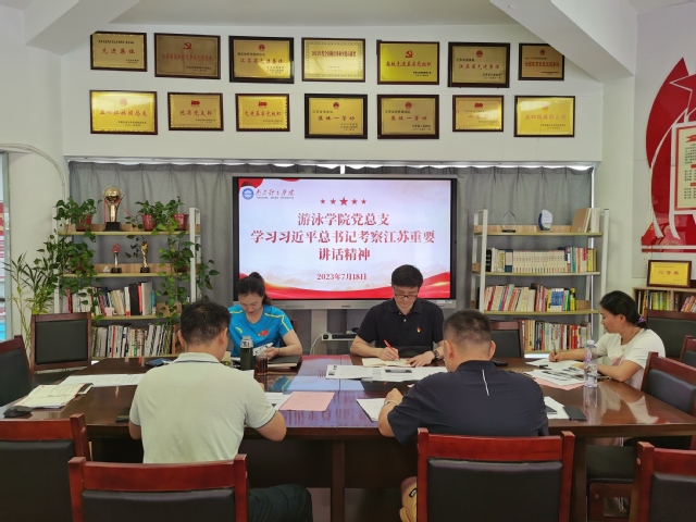 7月18日上午,游泳学院党总支在跳水花游馆二楼会议室召开理论中心组(扩大)专题学习会,认真学习习近平总书记在江苏考察时的重要讲话精神。会议由游泳学院党总支副书记骆晓娟主持并领学,全体管理干部参加学习。