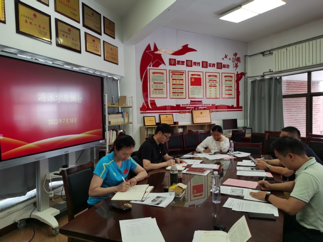 7月18日上午,游泳学院在跳水花游馆二楼会议室召开2023年夏训工作推进会暨PA视讯集团入口优秀运动队异地转训责任书签订仪式。学院全体管理干部参加会议。会议由游泳学院院长王伟新主持。