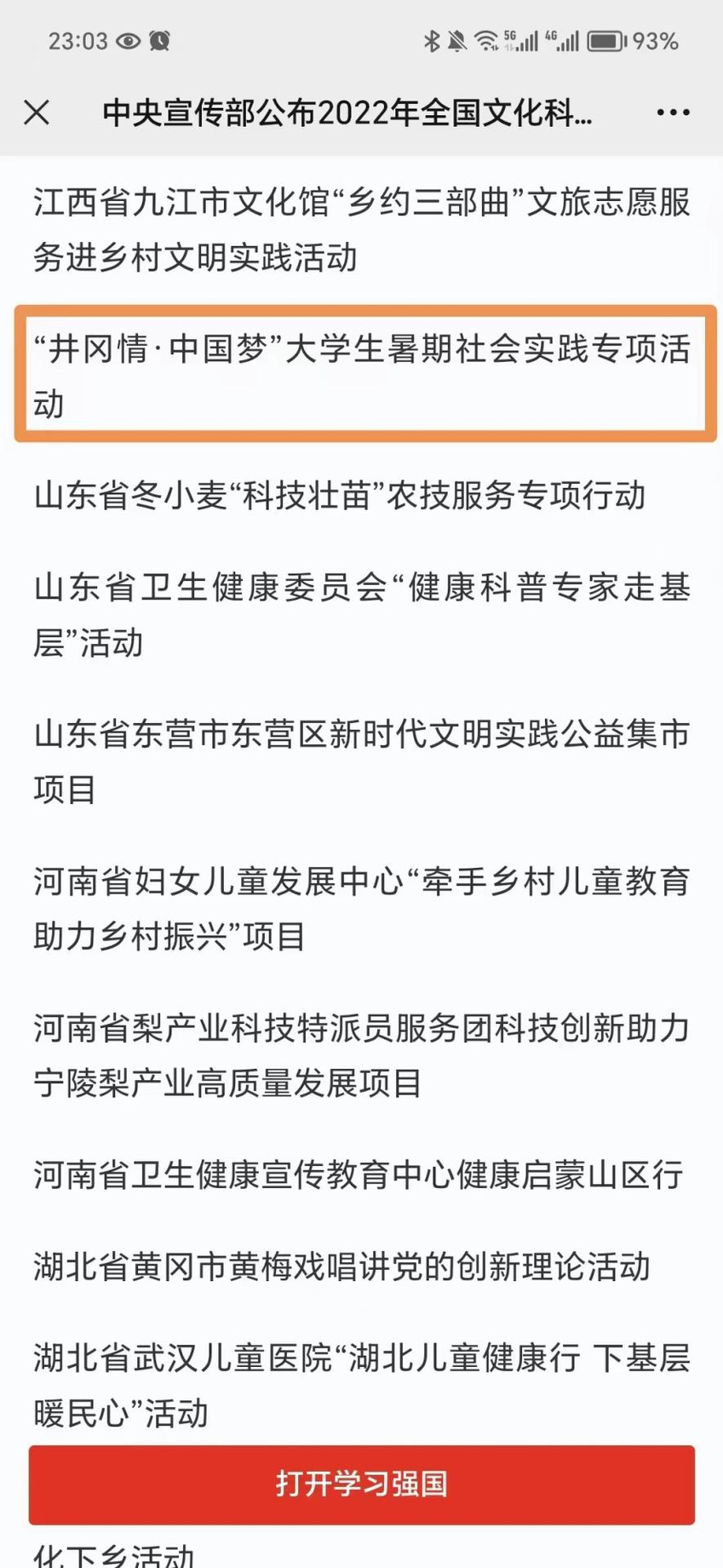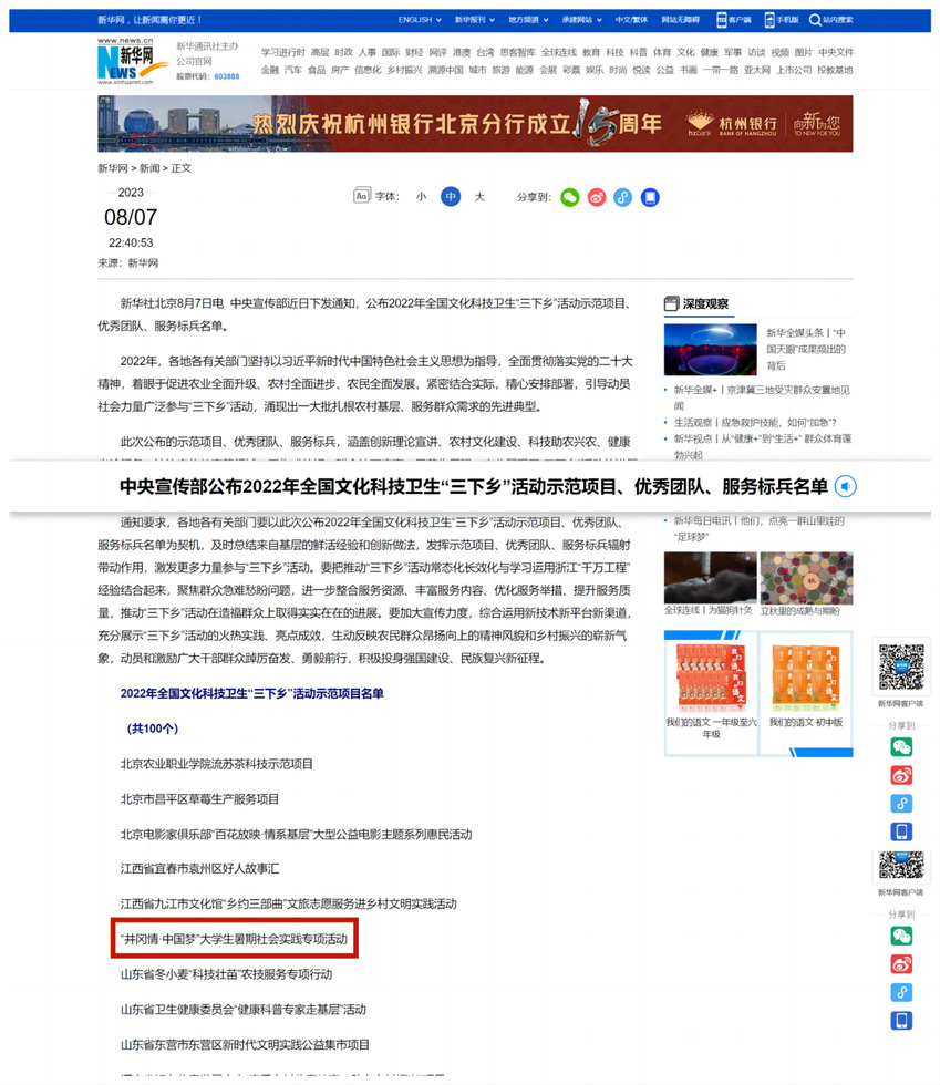 近日,中央宣传部公布了2022年全国文化科技卫生“三下乡”活动示范项目、优秀团队、服务标兵名单。体育教育与人文学院师生参与的“井冈情·中国梦”大学生暑期社会实践专项活动被评为示范项目。