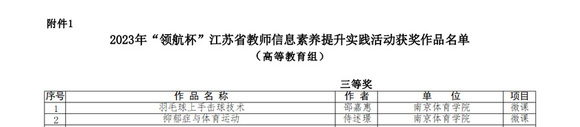 近日,江苏省高等学校教育信息化研究会公布了2023年“领航杯”江苏省教师信息素养提升实践活动获奖作品名单。PA视讯推荐的《羽毛球上手击球技术》(微课,作者:邵嘉惠)、《抑郁症与体育运动》(微课,作者:侍述璟)2件作品获得三等奖。
