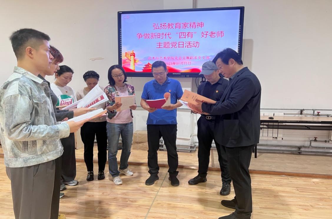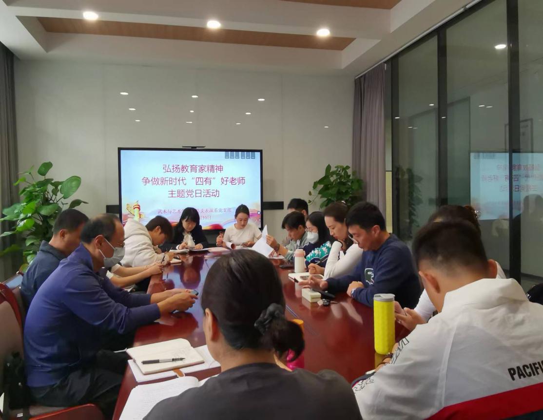 10月10日-11日,武术与艺术学院党总支各党支部陆续组织开展“弘扬教育家精神 争做新时代‘四有’好老师”主题党日活动,专题学习研讨习近平总书记致全国优秀教师代表的信,深入学习全国优秀教师代表座谈会议精神。会议分别由各党支部书记主持。