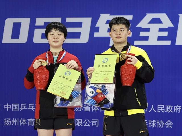 10月12日晚,乒乓球全国锦标赛在扬州迎来了混双项目的决赛,由乒羽学院乒乓球队运动员蒯曼和她的国家队队友林诗栋配合对阵向鹏/刘炜珊。蒯曼/林诗栋技高一筹夺得冠军。