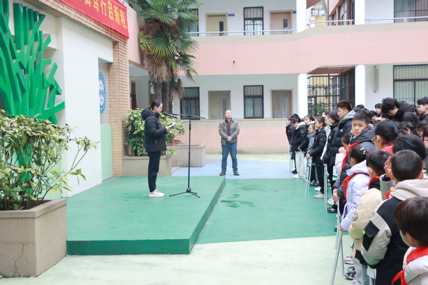 附属学校党总支副书记、副校长王蓉和大家分享两个优秀运动员的小故事,强调素养的重要性,鼓励全体学生通过日日训练、天天实践,提升个人修养与形成良好品质。她强调本学期工作重点:一是高度重视教学质量,开展高质量的教学工作;二是全面从严抓校风、学风,希望同学们要端正学习态度,提升课堂学习效率,提高学习成绩。