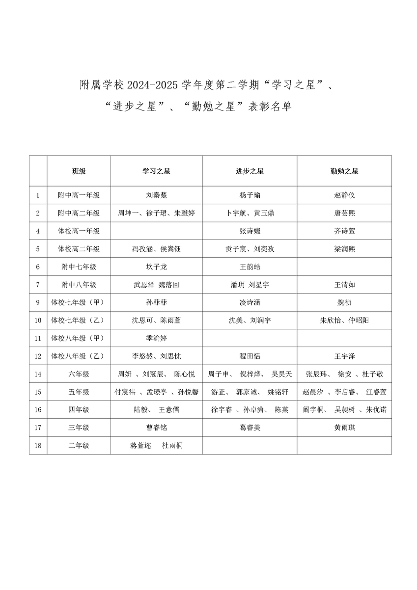 为了进一步激励全体学生树立坚定的理想信念,努力学习、尊敬师长、团结同学、礼貌待人、诚实守信,遵守校纪校规,积极参加学校各项活动,营造好学上进的优良学风、校风,PA视讯开展了“学习之星”、“进步之星”、“勤勉之星”的评选活动,经过各班级评选推荐,党总支研究决定授予刘秦楚同学等26人“学习之星”称号, 杨子瑜同学等23人“进步之星”称号,赵静仪同学等20人“勤勉之星”称号。