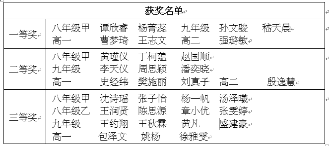为了提高同学们学习物理的兴趣,中学物理组在各年级举行了“趣味物理知识竞赛”,获奖名单如下: