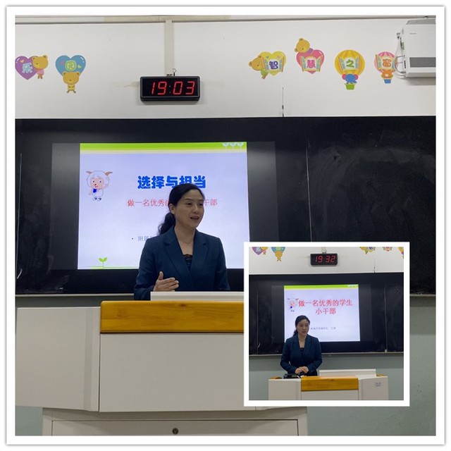 10月15日晚上,全体中小学部70多名学生干部分两批齐聚高三教室,参加学生干部培训会。副校长王蓉分别给中学部学生干部开展了“选择与担当,做一名优秀的学生干部”,给小学部的学生干部开展了“做一名优秀的学生小干部”主题的培训讲座。讲座分别从学生干部的重要性、学生干部的作用、干部的分工与职责,以及如何成为一名优秀的学生干部等内容展开,希望同学们积极发挥领头雁作用,架起老师与同学之间的桥梁,做好老师小助手,为建设优秀班集体、落实学校、班级的各项工作勇于担当,努力工作。通过学生干部聘用证书颁发的仪式教育,进一步培养学生干部的工作责任心和工作自信心。