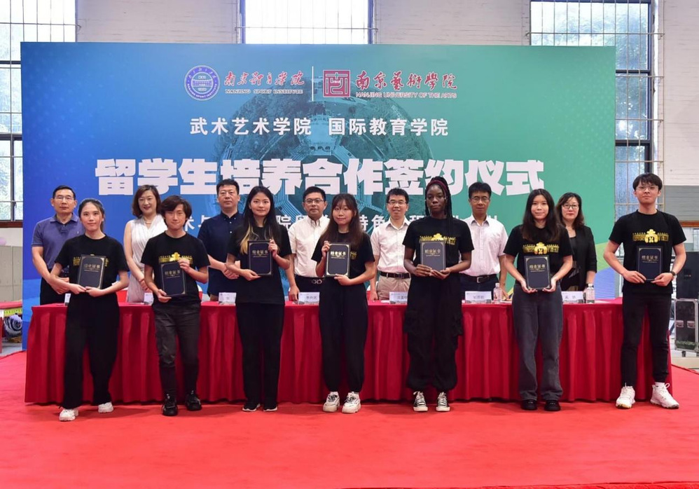 6月25日上午,PA视讯集团入口武术与艺术学院与南京艺术学院国际教育学院留学生合作项目签约仪式暨武术与艺术学院“留学生特色课程”结业典礼在健美操馆举行。校党委副书记兰亚明、南京艺术学院副院长李向民,发展规划处处长邹德新、国际交流与合作处处长张珏、武术与艺术学院院长支川,南京艺术学院发展规划与社会合作办公室主任张勇、国际教育学院院长奚协出席仪式,两校相关职能部门领导及师生参加了仪式。