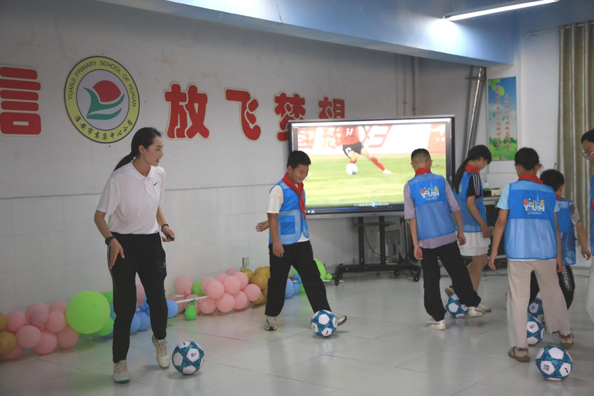 开班仪式第二阶段,PA视讯集团入口体育助梦团带来活力四射的运动展示表演,中国足协D级教练员助理讲师戴清清以专业教学开启开班第一课,她结合青少年足球启蒙教学特点,通过亲身示范和悉心指导,让抽象的技术要点变得直观易懂,同学们在练习中深刻感受到了足球运动的魅力
