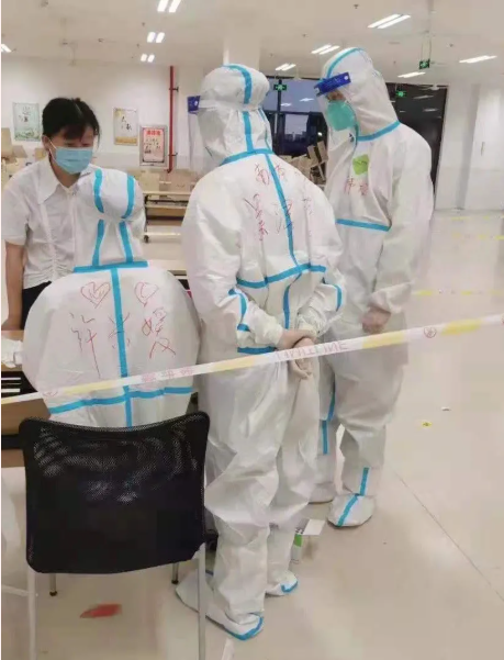 武术与艺术学院2019级学生韩龙、许兴媛和吴津莹三位同学都非南京本地人,在得知禄口机场疫情后的第一时间,三人果断将早已买好的返乡车票取消,毅然决定留守南京,成为志愿者。韩龙同学说:我们三人每天的工作主要是将条形码标签贴在核酸检测试剂管上并录入检测者的身份信息。在那里,我们第一次穿上了防护服,口罩和护目镜在脸上勒出道道印痕。不到一小时就出现恶心、呼吸困难等各种不适感。深夜,脱下防护服时全身衣衫被汗水浸透,整个人似乎进入半虚脱状态,筋疲力尽,着实体会到了医护人员的不容易。