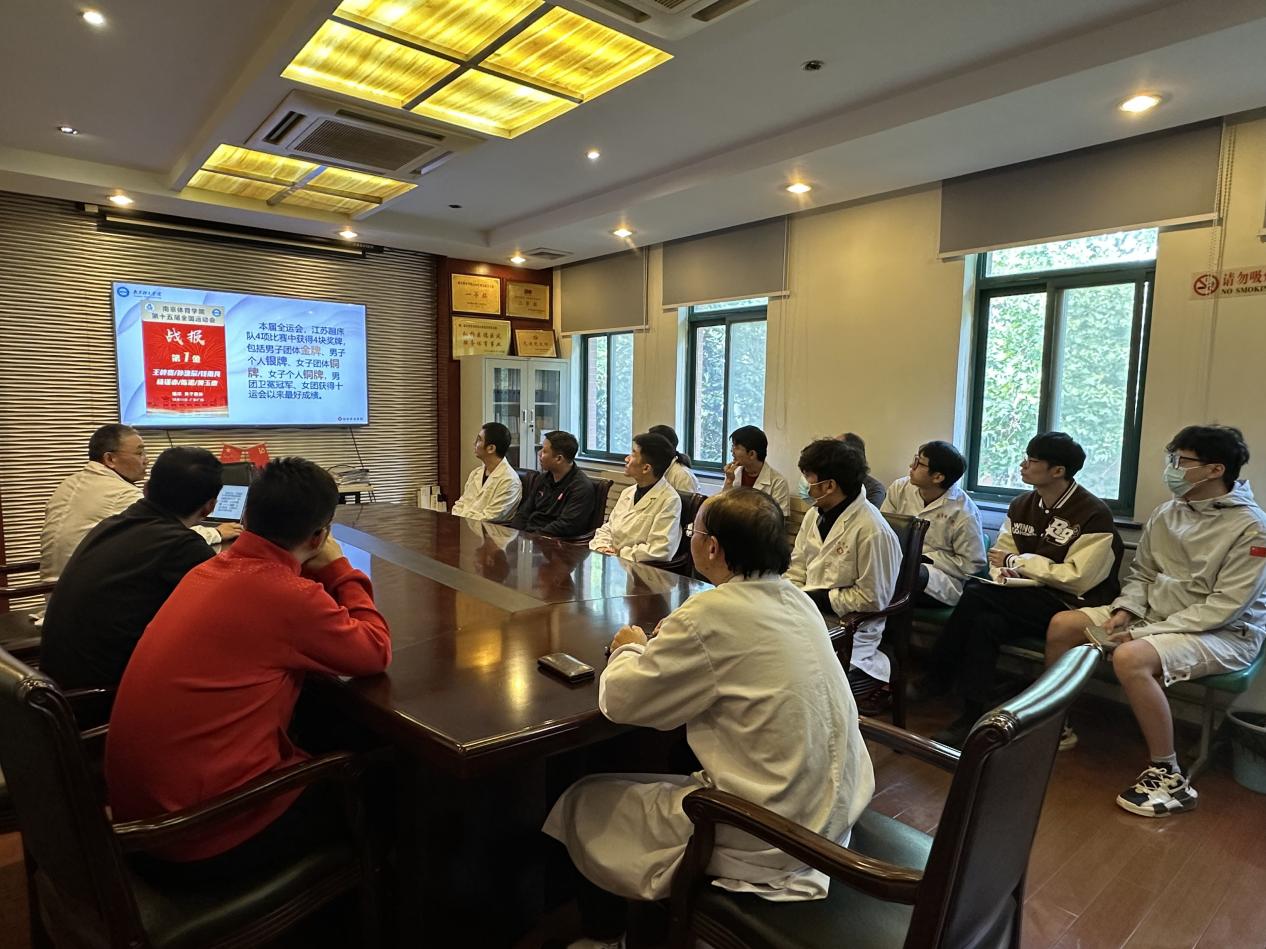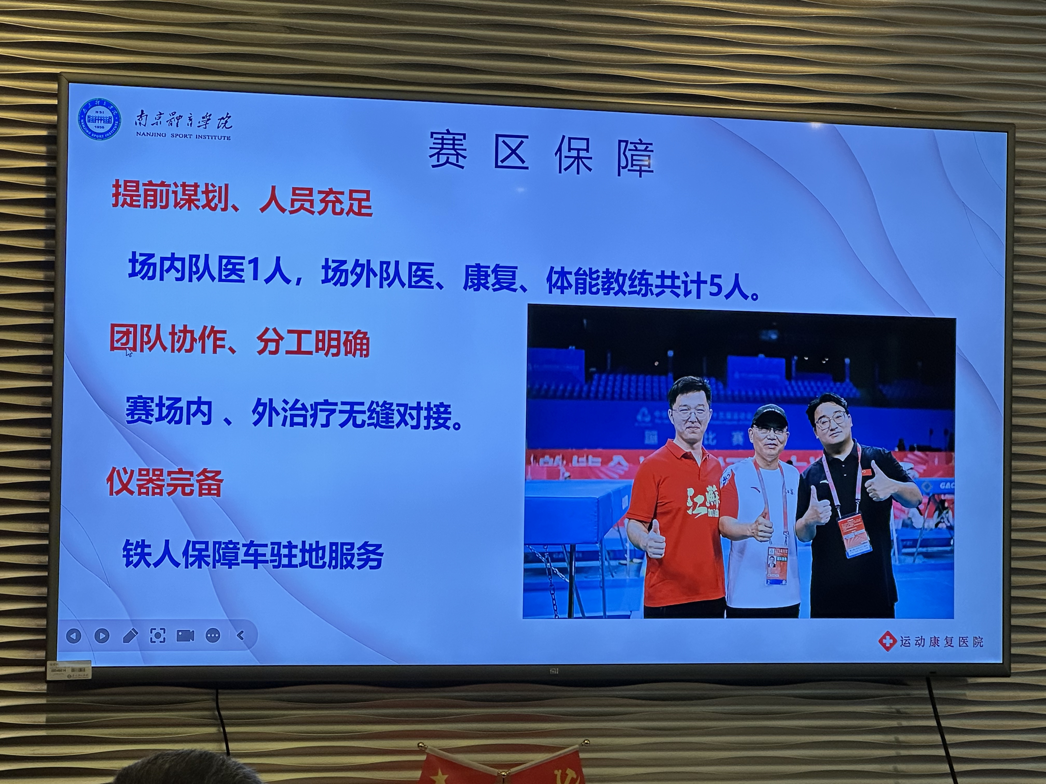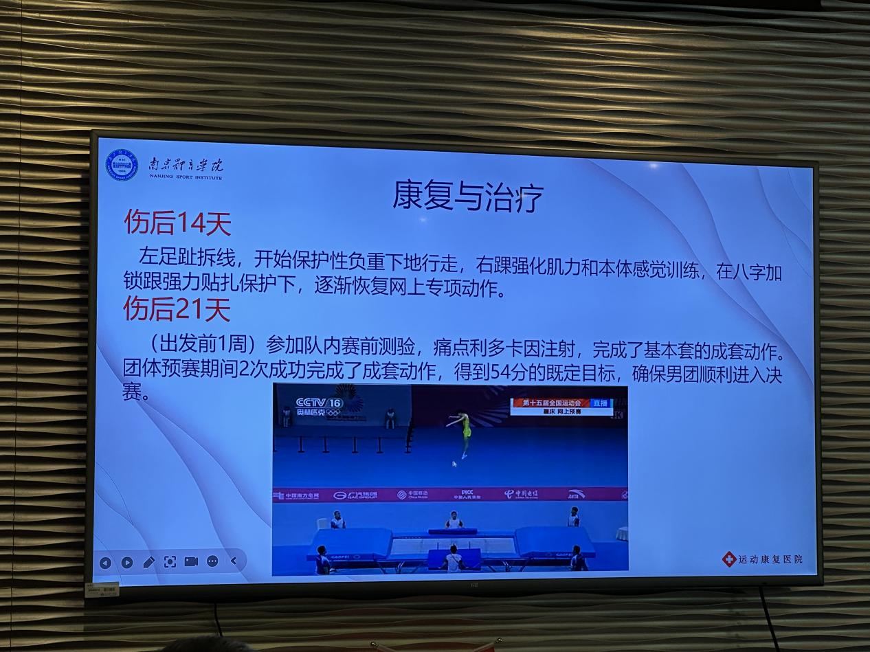 蹦床队医疗体能保障团队有5人组成,其中王鸿、王瑞、房东(长期保障外聘队医,现为扬州工业职业技术学院体育部教师)来自医院。王鸿主任详细介绍了赛前赛中出乎意外的紧急伤情、艰难曲折的诊治过程和令人惊喜的临床疗效。仪器手法齐上阵,内服外治巧运用,康复治疗同发力,临床思辨显真功!医疗保障团队秉持强烈的责任担当,锤炼精进专业技术,克服困难,破除拘囿,终以满意的临床疗效助力江苏蹦床队取得全项次、全体队员登上领奖台的辉煌战绩!