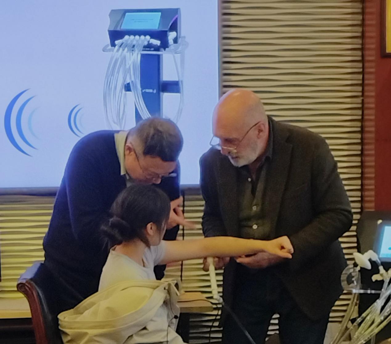 讲座中,Claudio Polidori先生围绕振动疗法发展历程、VISS技术理论基础展开分享,详细阐述了该技术的独特优势及临床应用经验。他特别指出,帕尼氏小体在运动康复中扮演关键角色——肌肉不同靶点对特定波形、频率及刺激方式存在敏感性,通过精准刺激传递神经反应信息至中枢系统,可有效激活人体潜力、改善肌肉功能,助力运动员突破技术瓶颈、提升运动表现。分享结束后,Claudio Polidori先生还为蹦床队、体操队运动员进行了现场诊治,取得了良好的即时疗效。