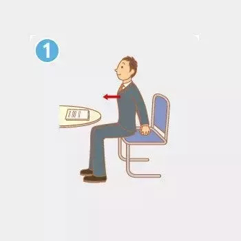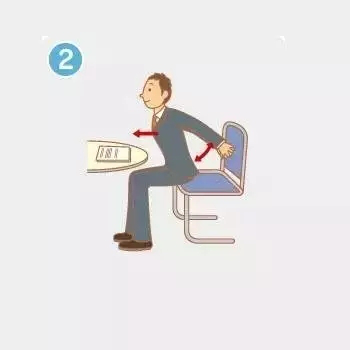 ①椅子不要坐得太深,坐到椅子的3分之1的位置,挺胸收腹,双手放在背后,双掌合实,十指紧扣。肩胛骨尽量往中间挤压,挺直胸膛,保持15秒。