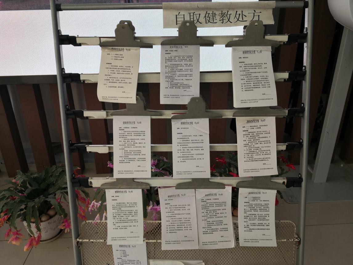 镜头三:健康知识的传播和宣教,让你身在医院时时能学习、处处有收获。一楼大厅有醒目的电子大屏,滚动播出各种专题的健康知识,有高血压的自我检测,有糖尿病的日常管理,有创伤急救的基本技术……健教处方自取架上摆满了专家编著的健教处方,更是种类齐全,权威实用。诊室门外的墙上制作了《健康之窗》宣传展板,图文并茂,内容丰富,按季度更新。