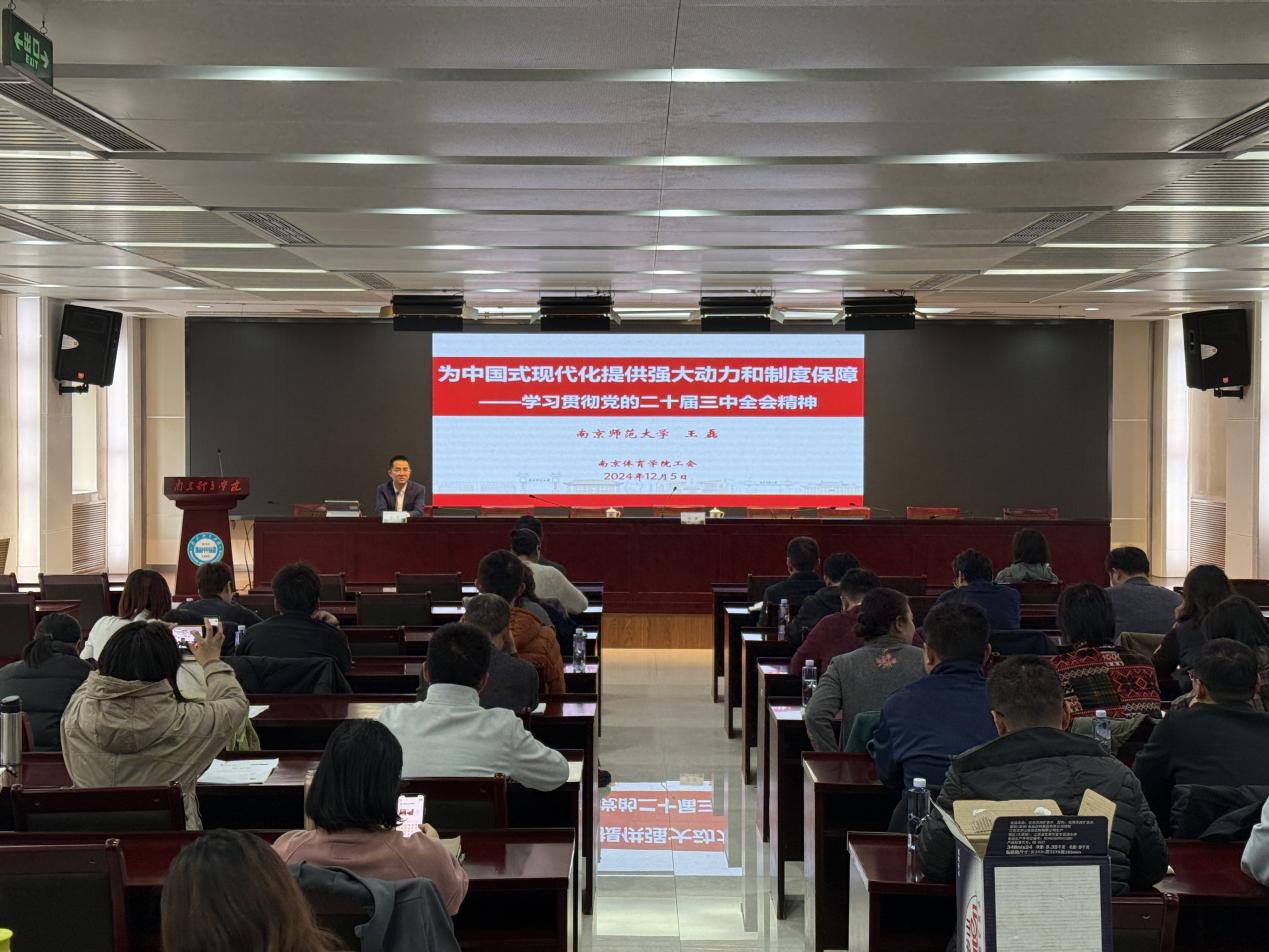 讲座邀请省五一劳动奖章获得者、南京师范大学马克思主义学院王磊教授作《为中国式现代化提供强大动力和制度保障——学习贯彻党的二十届三中全会精神》专题讲座。王磊教授从党的二十届三中全会的基本情况、深入学习领会习近平总书记在全会上的重要讲话精神、全面准确理解《决定》提出的重大改革举措、全力以赴抓好全会精神贯彻落实这四个方面进行了深度解读,引导参会党员、干部在思想政治引领上主动作为,坚持不懈用习近平新时代中国特色社会主义思想凝心铸魂,将其转化为坚定理想、锤炼党性和指导实践、推动工作的强大力量,为“新南体”建设贡献力量。