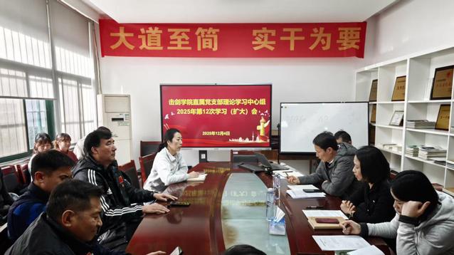 12月4日上午,击剑学院直属党支部在击剑馆一楼会议室召开理论学习中心组2025年第12次学习(扩大)会。理论学习中心组全体成员及全体党员参加学习,会议由击剑学院直属党支部书记朱小兰主持。
