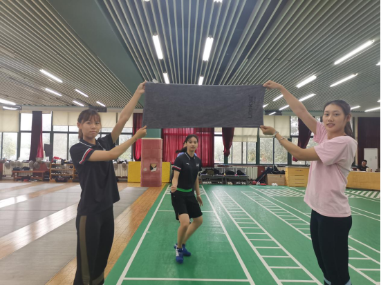 女佩组运动员展示运动毛巾