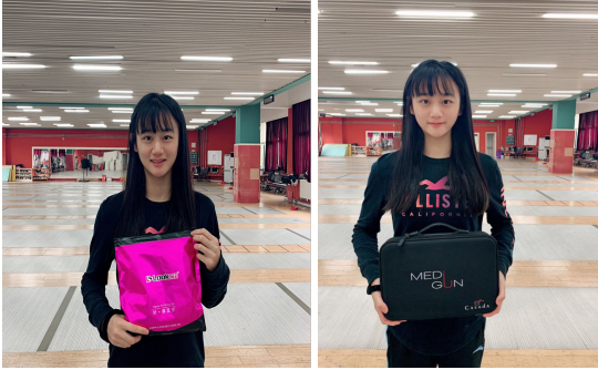 女花运动员樊施丽展示运动毛巾与筋膜枪