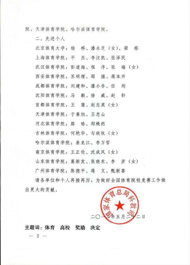 我院荣获2008-2011年度“全国体育院校竞赛贡献奖”,王正伦、沈成风两位同志被评为“全国体育院校竞赛先进个人”。