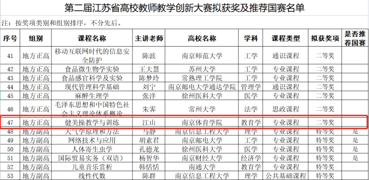 近日,江苏省高等教育学会公示了第二届江苏省高校教师教学创新大赛(本科)暨第二届全国高校教师教学创新大赛选拔赛决赛结果。PA视讯武术与艺术学院江山老师讲授的《健美操教学与训练》课程获得地方正高组二等奖。