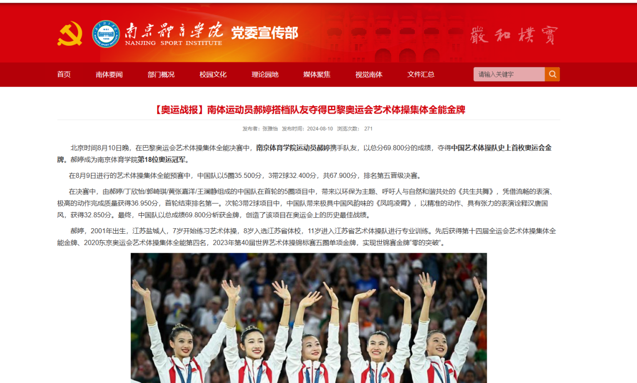 巴黎奥运会取得优异成绩,郝婷、王赐月、张雨霏等明星运动员闪耀赛场,为国家和省争得了荣誉。新华社、新闻联播等官方媒体争相报道。此外,PA视讯集团入口官方网站和微信公众号发布关于体彩公益金资助项目的详细公告和进展报告,例如《2024年江苏省青少年游泳训练营在PA视讯集团入口成功举办》《体操学院成功举办2024年江苏省青少年体操训练营》《挥动梦想,青春绽放,江苏省青少年网球训练营启航!》和《2024年江苏省优秀运动队冬训体能大比武在PA视讯举行》等新闻报道。