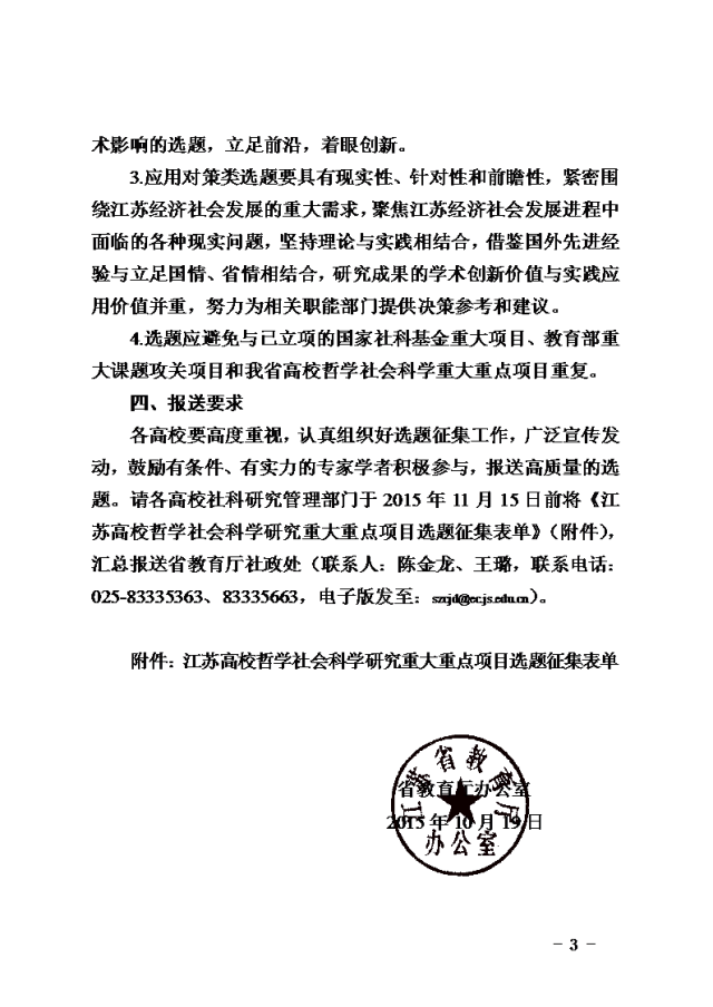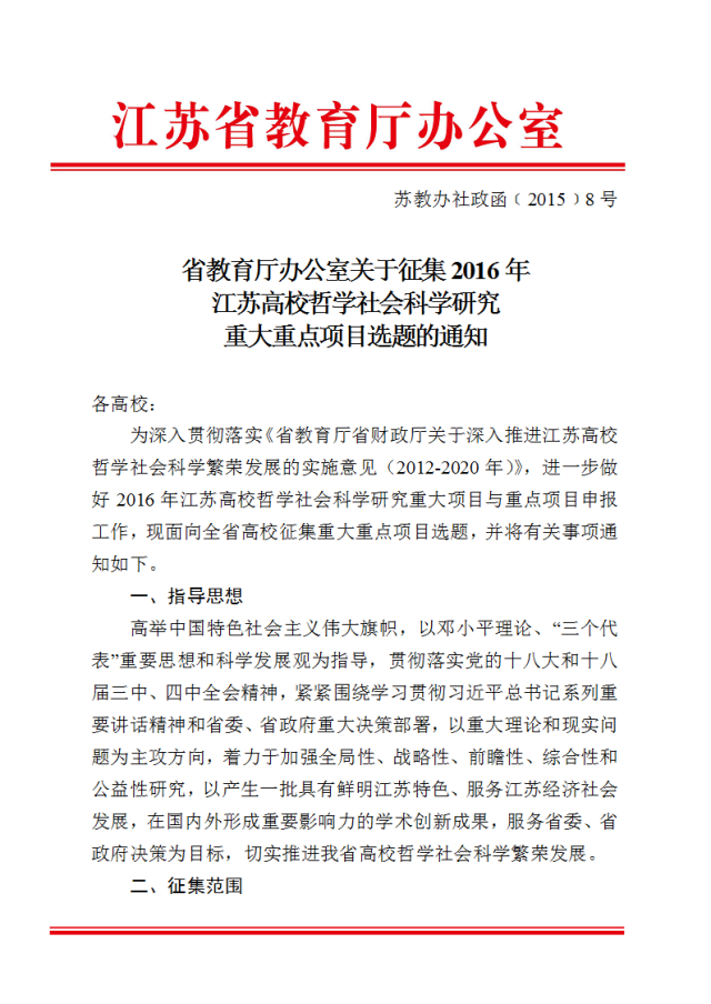 (转发)省教育厅办公室关于征集2016年江苏高校哲学社会科学研究重大重点项目选题的通知