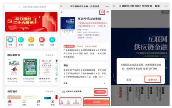 2)微信端首页—书城—进入详情页,在图书详情页,点击“在线阅读”按钮可以试读部分,超出试读部分会提示免费PDA,PDA完成后即可阅读全文。