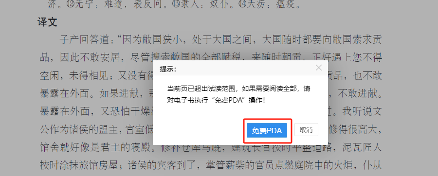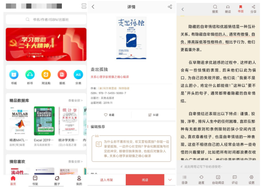 3)APP端首页--点击书城-进入详情页,在图书详情页,点击“在线阅读”按钮-可以试读部分,超出试读部分会提示免费PDA,PDA完成后即可阅读全文,还可下载加入书架。