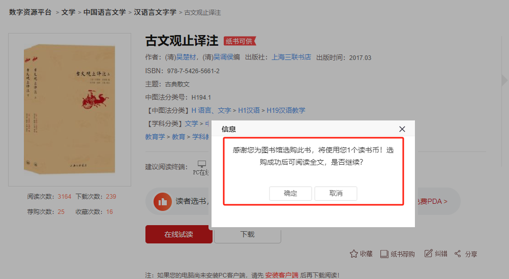 1)PC端首页—检索框中输入关键词—进入检索详情页,在图书详情页,点击“在线阅读”按钮可以试读部分,超出试读部分会提示免费PDA。在图书详情页可以进行PDA、评论、收藏、分享等;可以在个人中心查询到PDA操作记录。