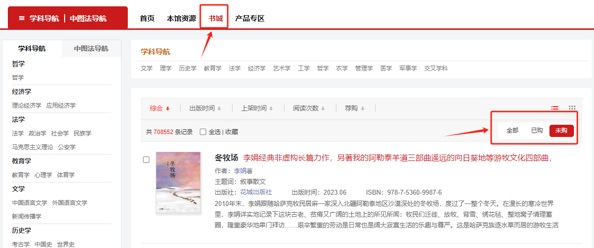 首页默认本馆资源数据,电子书数据库在首页有单独的模块入口--进入详情页-点击阅读或者加入书架-阅读或者下载全文