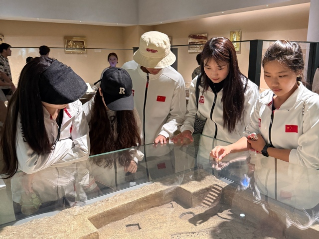 明孝陵博物馆坐落于南京市钟山风景名胜区内,其建筑风格采用明清时期江南地区元素,与周边自然环境相互映衬,完美契合了明孝陵“天人合一”的建造理念。这里不仅是世界文化遗产明孝陵的“前厅”,更是一座浓缩了明朝初年历史风云的时光胶囊。走进明孝陵博物馆,同学们跟随讲解员从“大明风华”主题展厅开始文化采风之行。馆内的每一块石雕、每一件展品,生动地再现了明朝的历史风貌,仿佛带人回到风起云涌的时代,感受那段辉煌而跌宕的历史。