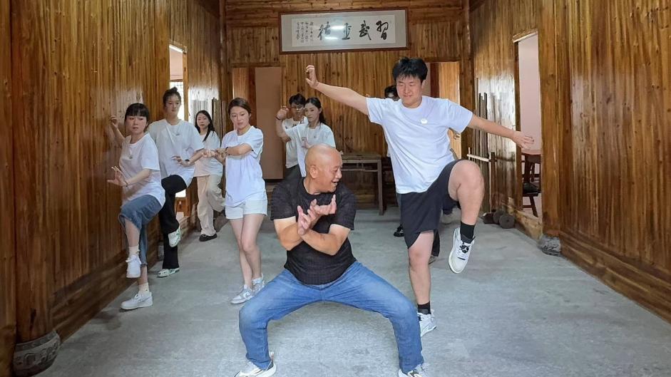 在龙泉市安仁镇,小石榴团队来到菇民防身术传承人周有平老师的教学基地,开启了此次非遗之旅的首站。团队成员围绕菇民防身术的历史由来、技术特点、开展现状及传承人经历等展开调研采访。周有平老师介绍道:“菇民防身术源于畲族菇民在山林迁徙与商旅运输过程中的自我防护实践,它依托扁担、斧头等简易器械逐步演化而成,兼具实用性与攻防一体的特性,如今已被列入地方非遗项目名录。但现在面向的主要群体还是中小学生,经常在学校中开展教学课程。”采访结束后,团队成员现场观摩了周有平弟子和学生的“凳花”“棍花”“拳法”套路动作,成员韩昌彤还展示“长拳”动作与老师交流切磋。交流结束后,团队成员跟随周有平老师学习菇民防身术,亲身感受这一传统技艺所承载的独特魅力。周有平老师还详细阐释了菇民防身术特有的“虚步抱拳礼”的文化寓意,让团队成员深刻领悟到武术中“以礼为本”的精神内核,更深刻地感受到非遗传承人的文化坚守。
