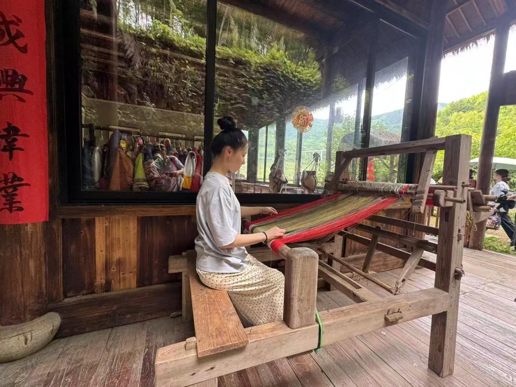 非遗之旅的最后一站,团队走访了位于东弄村的畲族织绣馆。该展馆展示的畲族传统彩带、服饰与刺绣作品,充分彰显出畲族妇女在图案构思、色彩运用和编织技艺方面的卓越创造力。工作人员详细介绍了彩带图案中蕴含的丰富文化意象,例如对称花纹象征着自然和谐,几何图案则寓意家族团结、生活富足。在手工织彩带的演示环节,成员们亲眼目睹了一条彩带是如何在匠人的精湛技艺下逐渐成形,深刻感受到了非遗技艺背后所蕴含的时间积淀与文化传承的力量,以及传承人为守护这份技艺所付出的努力。