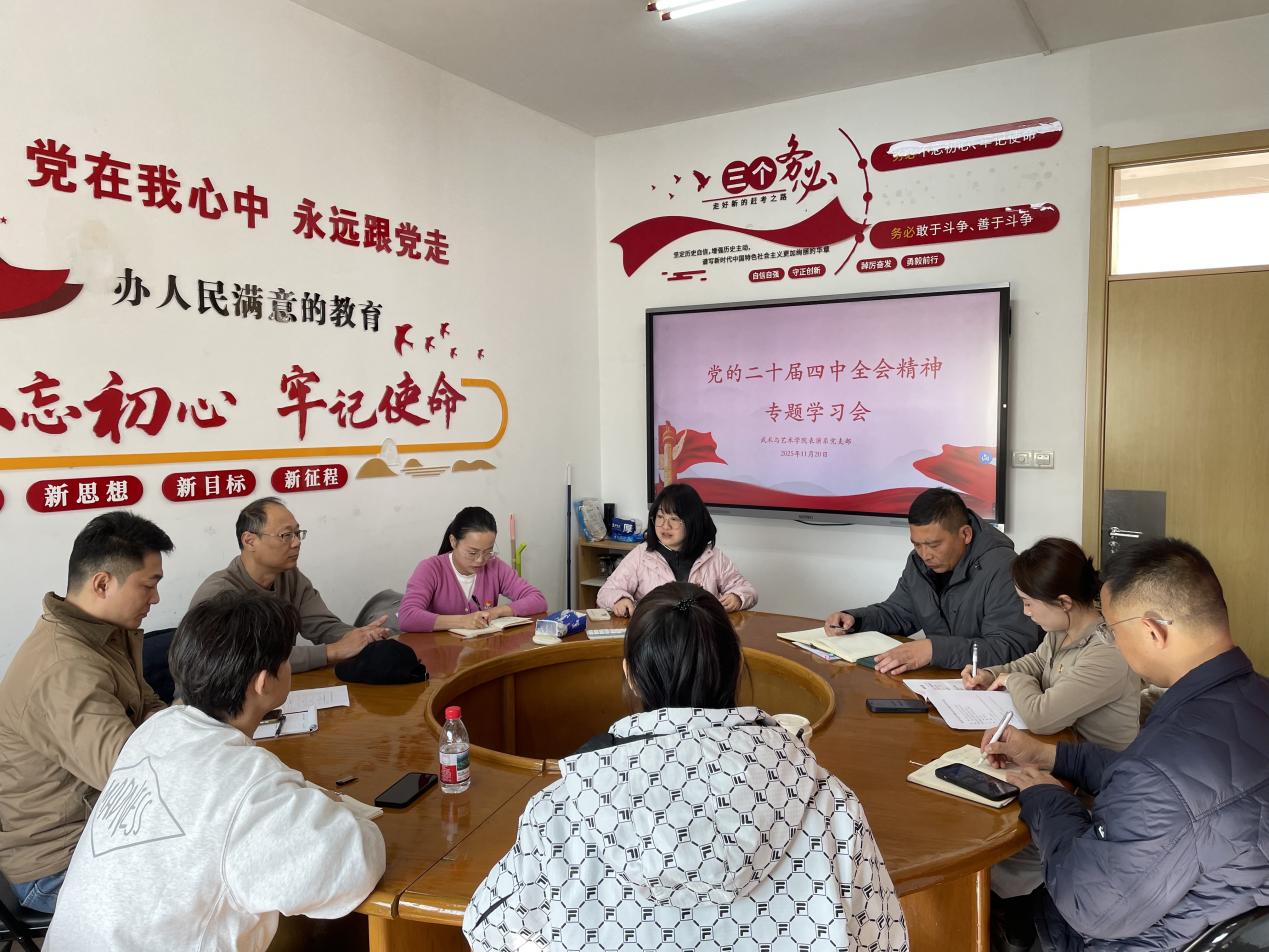 2025年11月20日,武术与艺术学院表演系党支部在教学实验楼2号楼308会议室召开党的二十届四中全会精神专题学习会。党支部全体成员参加会议,会议由党支部书记吴平平主持,院党总支副书记、院长张明参加会议。