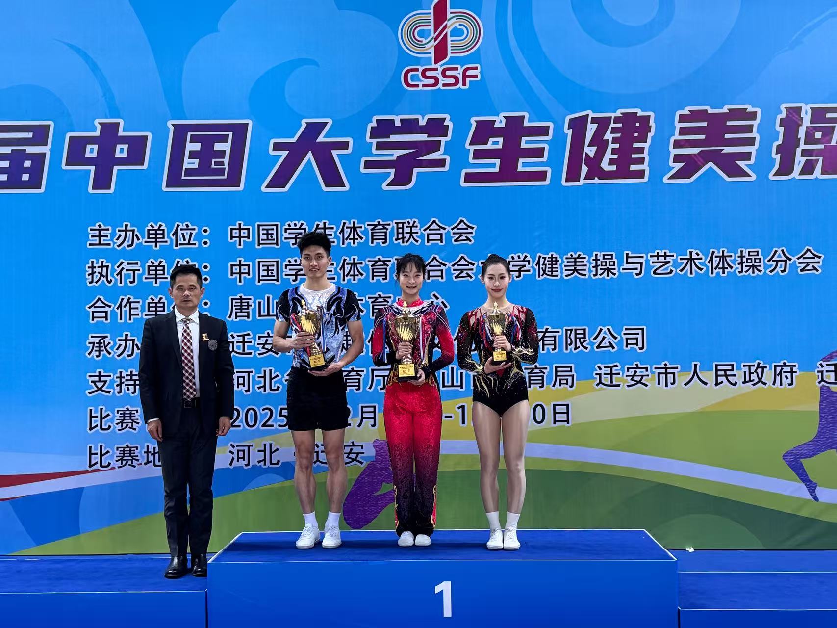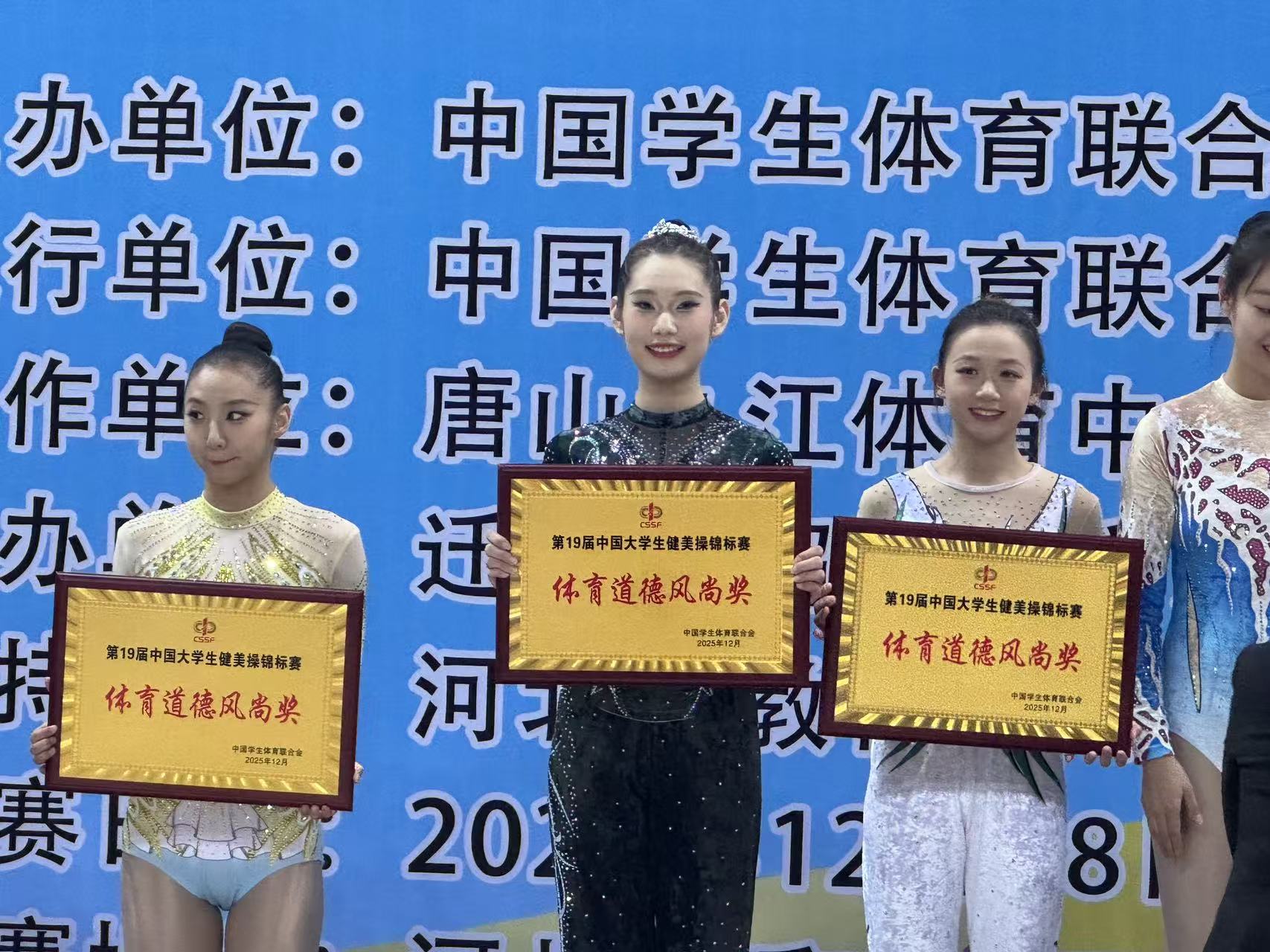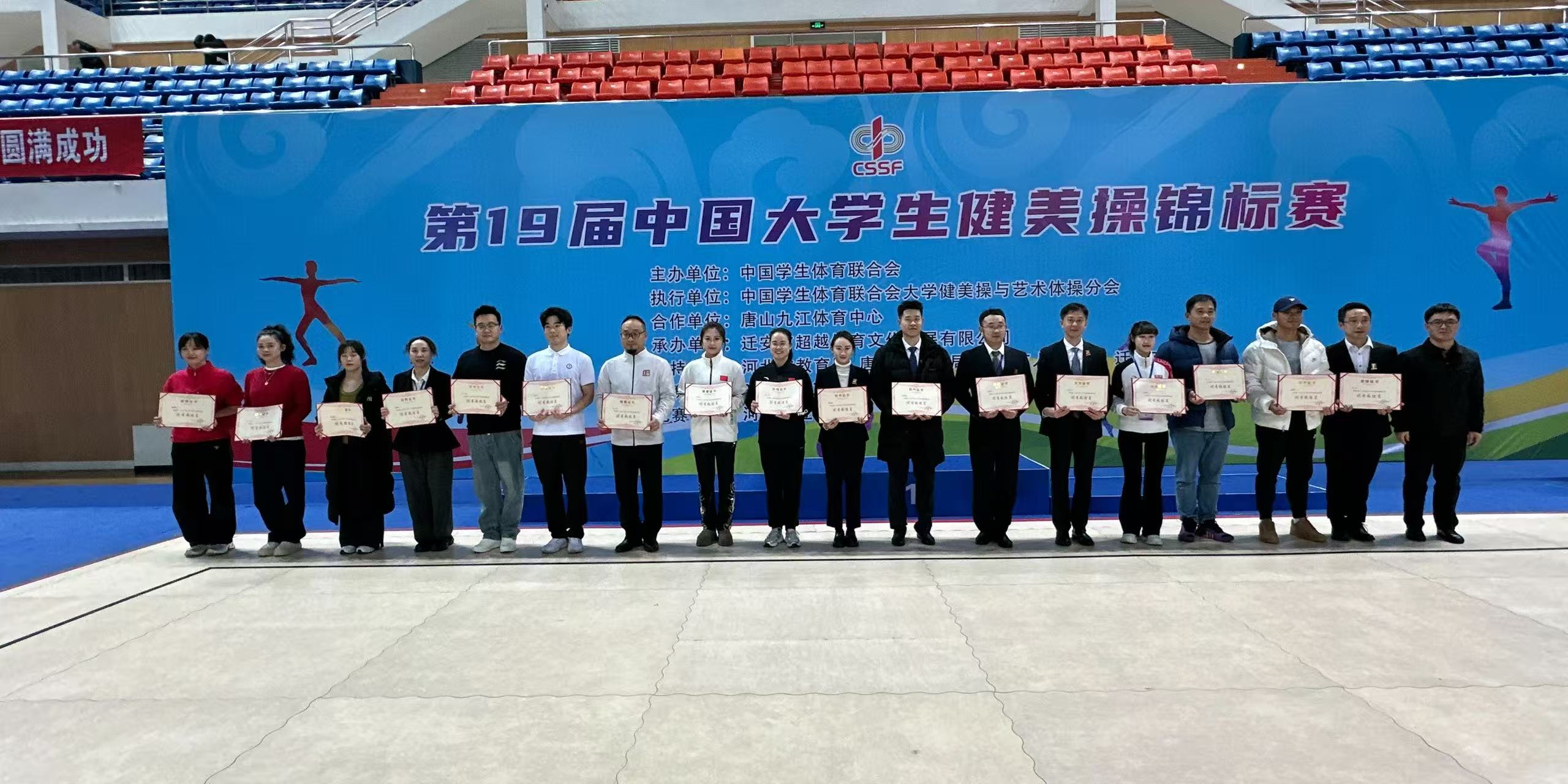 12月16日-12月20日,第19届中国大学生健美操锦标赛在河北迁安市圆满举办。作为全国健美操项目最高水平赛事之一,本次大赛由中国学生体育联合会作为主办单位,由河北省教育厅、唐山市教育局、迁安市人民政府、迁安市教育局联合支持,吸引了全国健美操领域的顶尖学子同台竞技,赛场之上高潮迭起,竞技氛围分外浓厚。校健美操队派出武术与艺术学院23名、体育与人文学院1名运动员组成参赛阵容,由武术与艺术学院副书记杜家俊担任领队,体操系教师王连睿、席瑞阳和舞蹈系教师吴文君担任教练,全力冲击女子单人操,男子单人操、三人操、五人操,混合双人操、有氧舞蹈及民族健身操项目。