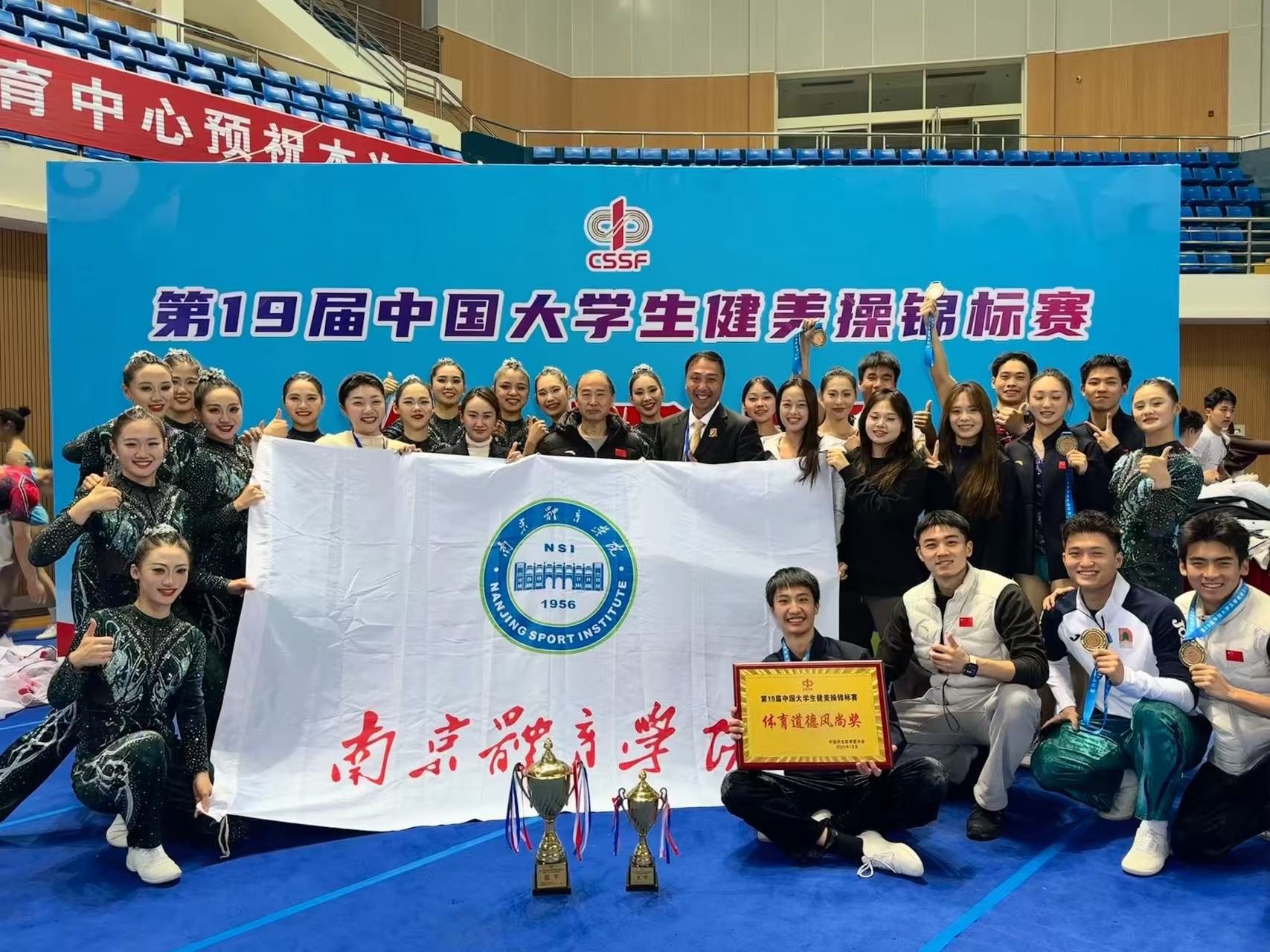 赛场上,这支由24名队员组成的队伍全力冲刺,凭借超强毅力与默契协作站上赛场。最终,他们奋勇拼搏、不负众望,一举斩获多项佳绩:甲B组-规定动作-民族健身操第1名,丙A组-自选动作-男子单人操第2名,丙B组-自选动作-五人操第4名、三人操第3名、男子单人操第7名、混合双人操第3名、女子单人操第6名、有氧舞蹈第4名,此外,队伍还斩获丙B组团体总分第3名,并荣膺体育道德风尚奖、优秀裁判员奖和优秀教练员奖,成功刷新南体健美操队在单项赛事中的历史最佳成绩。