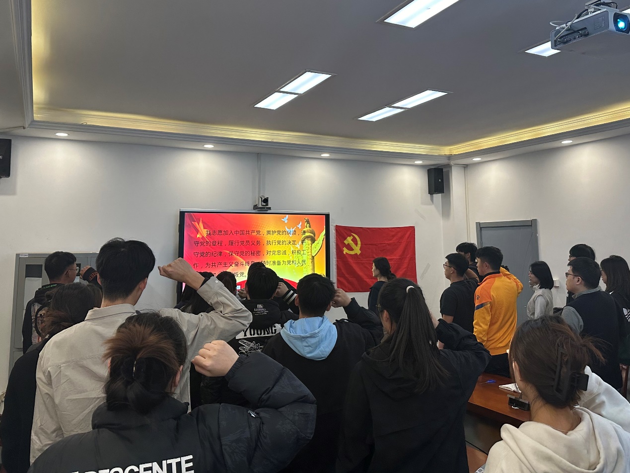 随后,学生党支部教师党员吴海艳、黄洪分别向新发展的党员代表们佩戴党徽,“戴党徽、亮身份”表明党员身份,强化责任担当,共同树立新标杆。党员亮身份不仅是形式上的展示,更是一种使命与担当,提醒各位学生党员时刻牢记自己的身份和使命,增强责任意识和奉献意识,不断提高思想觉悟和政治素质,全心全意为同学们服务,做到言行一致、表里如一。随后学生支部的全体党员一起签订了廉洁承诺书,共同重温入党誓词。