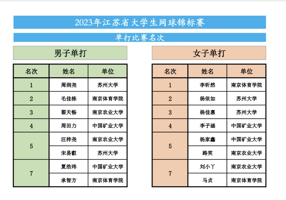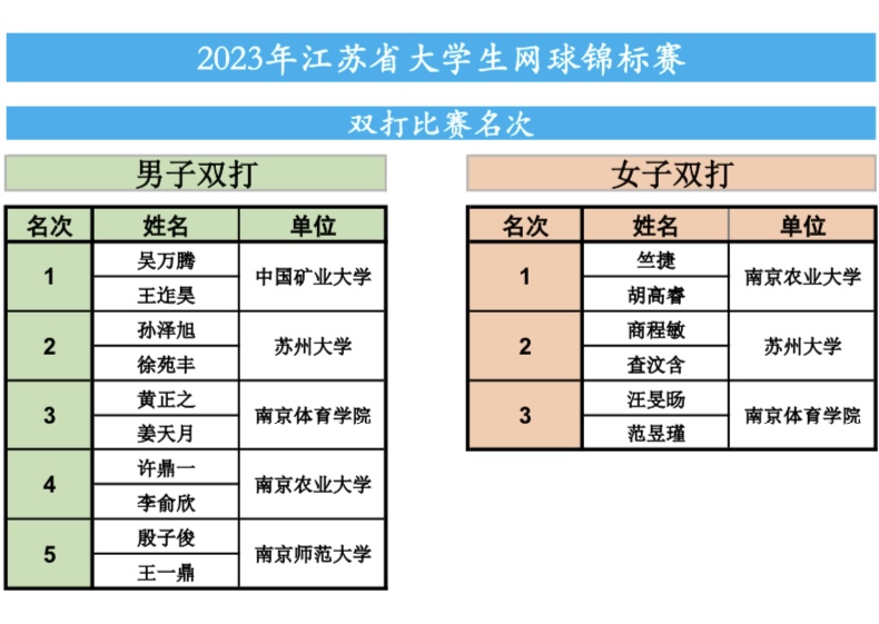 12月8--10日,2023年江苏省大学生网球锦标赛(高水平组)在南京师范大学举行,PA视讯大学生网球代表队由运动训练学院矫莉华、吴国宁老师担任教练员,带领8名网球专项学生参加了男单、女单、男双、女双共4项比赛。经过2天激烈角逐,南体健儿顽强拼搏,充分发挥敢打敢拼的精神,经过多轮对战,最终PA视讯大学生获1金1银2铜的优异成绩。