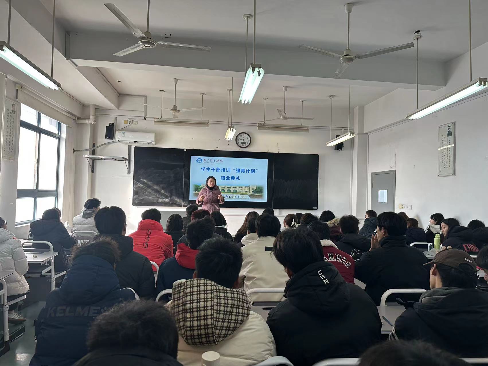 为激励学生干部奋发向上,充分发挥先锋模范作用和桥梁纽带作用,提升学生干部的领导能力、组织能力以及协调能力,在全院营造学先进、赶先进、争先进的良好氛围。2023年12月21日上午,运动训练学院于仙林校区501教室举行了学生干部“强青计划”的结业典礼。院党总支书记葛见珠、副书记杨蓉及所有辅导员参加本次活动,活动由新生辅导员龙文蓉主持。