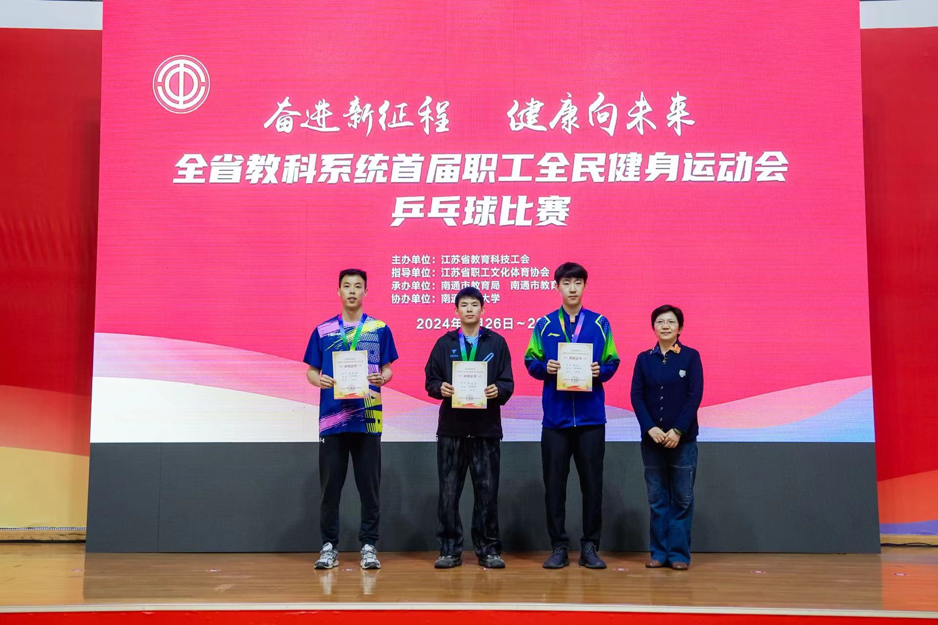 由江苏省教育科技工会举办的全省教科系统首届职工全民健身运动会乒乓球比赛于2024年4月26日至29日在南通举行。PA视讯乒乓球教师万乔宇代表直属高校工会联队参加比赛。
