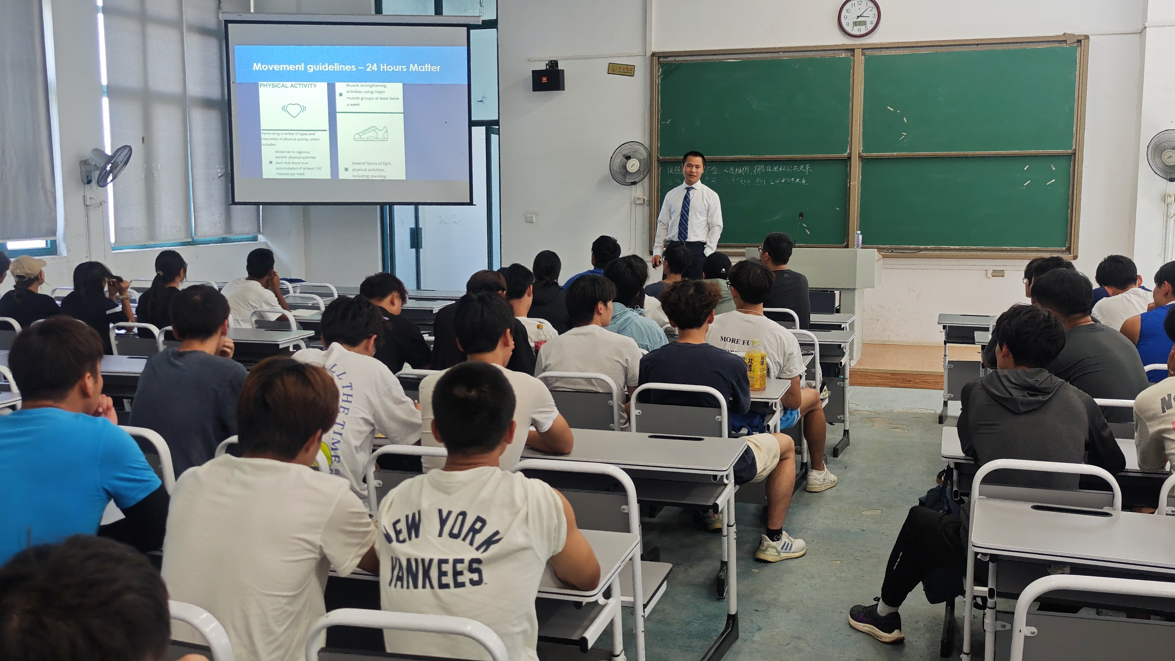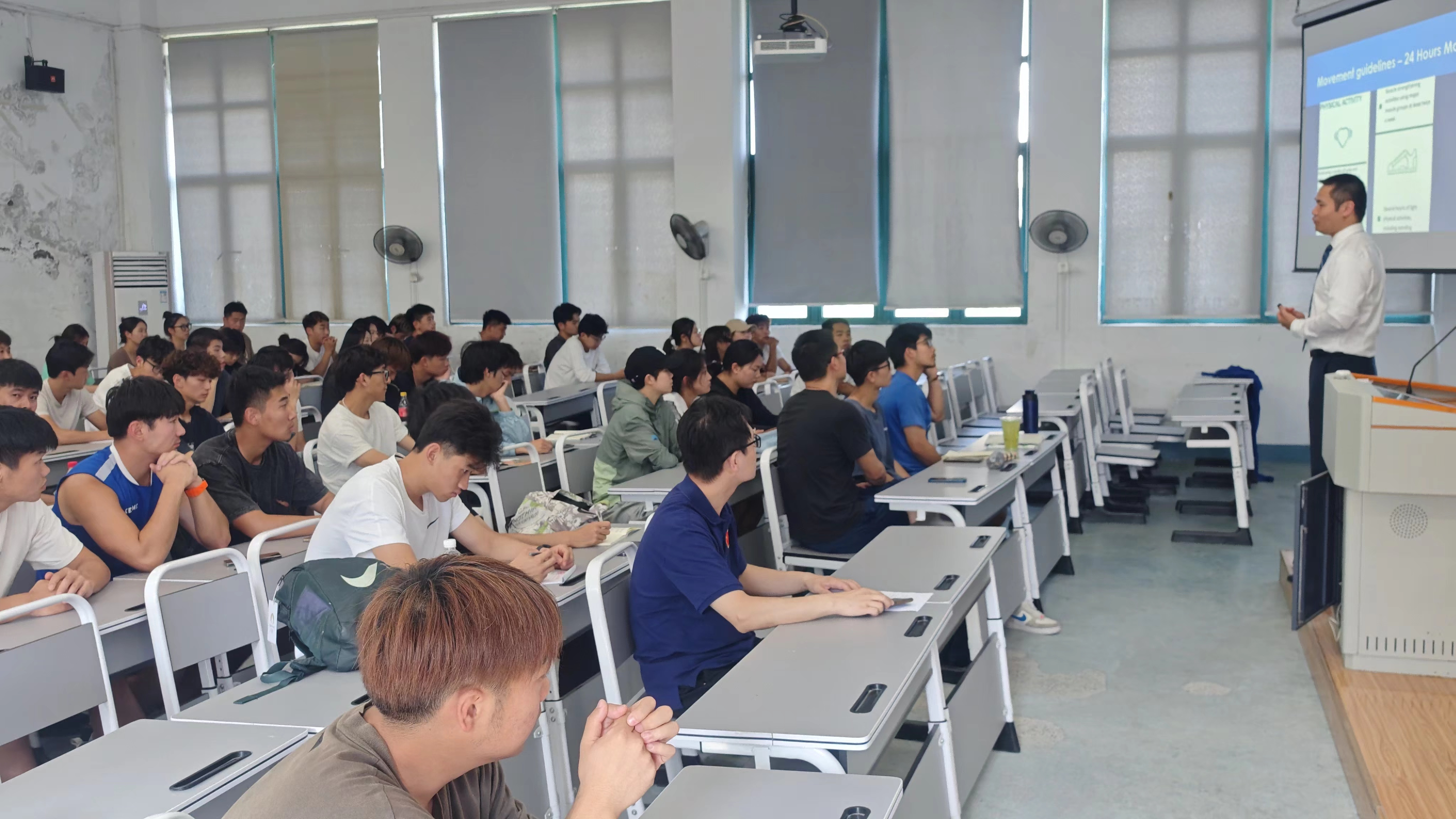 此次讲座,朱教授采用中英文双语的模式,主要介绍了三个方面的内容,一是强调了运动对身体健康的重要性。二是运动行为与健康的关系,包括脑健康、心理健康等,并谈到了运动对于对焦虑和抑郁的改善;三是不同类型的运动对身体的益处。他介绍了有氧运动、力量训练、柔韧性练习等多种运动方式,并针对不同年龄段和体质状况的学生给出了相应的运动建议。