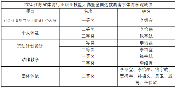 运动训练学院在2024江苏省体育行业职业(社会体育指导员——健身教练)技能大赛暨全国选拔赛获奖成绩统计: