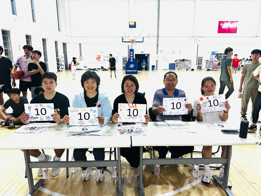 本次大赛特邀运动训练学院党总支书记葛见珠、运动训练学院副院长赵西堂、篮排系副主任范海燕担任专业评委,同时创新性地邀请两名非篮球专项学生加入评审团,兼顾专业性与大众视角,确保赛事公平多元。比赛现场座无虚席,观众席上此起彼伏的呐喊助威声与动感音乐交织,将场馆气氛推向高潮。